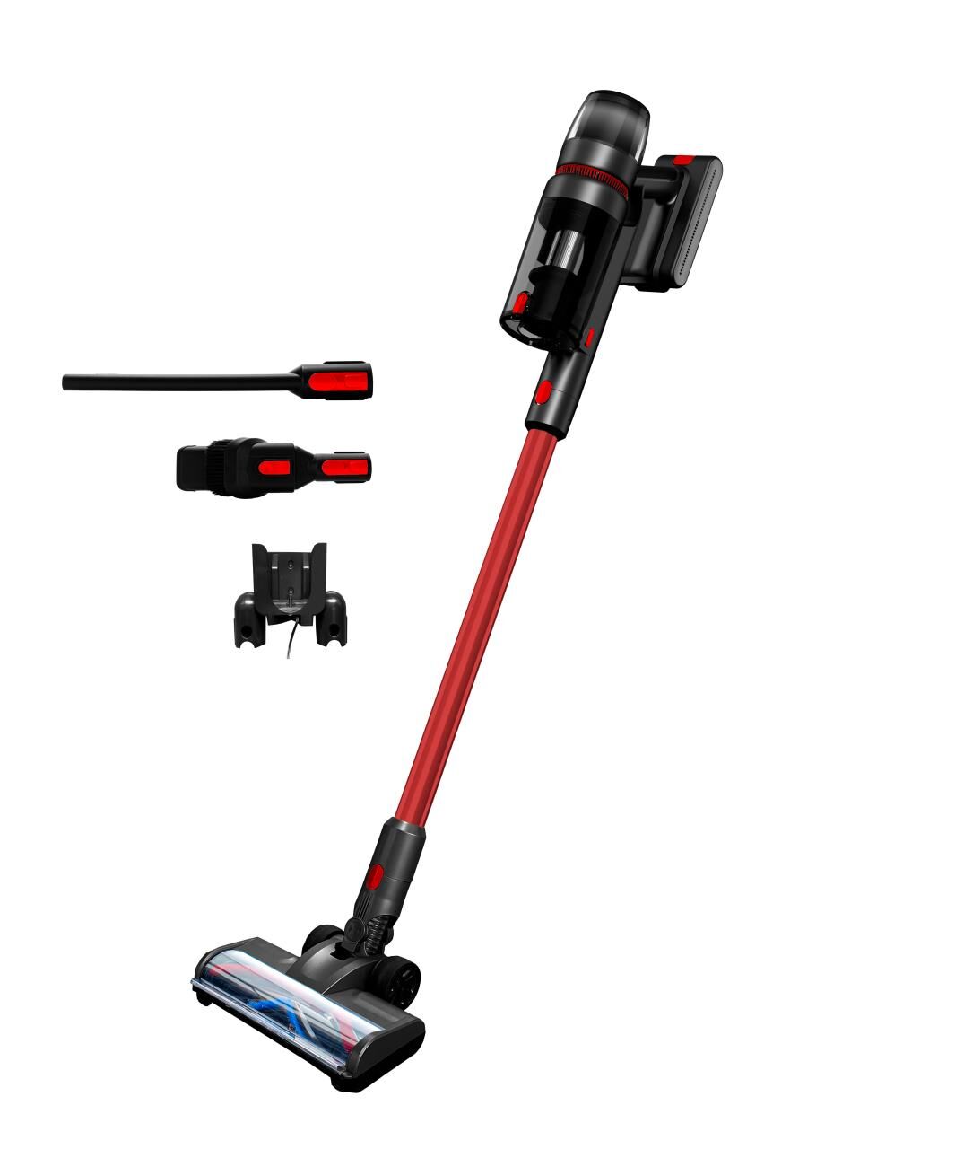 Supplied with wall-hanger, Motorized floor tool with LED lighting, mini dual function brush, charger, removable battery & crevice tool.